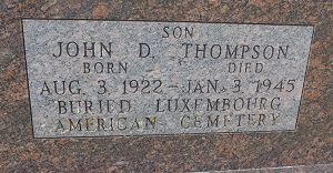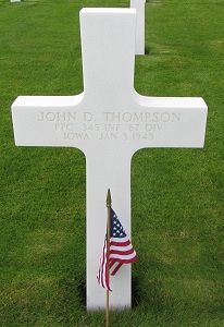 Pfc John D. Thompson attended high school for four years and worked on a farm before he enlisted at Camp Dodge, Iowa on 6 January 1943.He was first buried at the Temporary American Military Cemetery in Grand Failly, France.