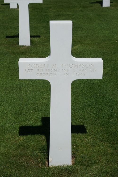 Source of information: Peter Schouteten, www.abmc.gov, www.wwiimemorial.com, www.archives.gov - WWII Enlistment Record, www.ancestry.com - Headstone and Interment Record / Thompson Family Tree / 1930 Census, http://www.ww2-airborne.us