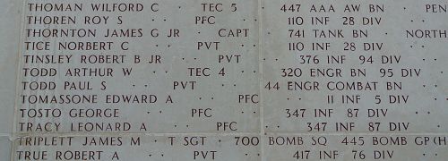 Pfc Edward A. Tomassone joined the Regular Army when his father signed the papers because he was too young to enlist.Pfc Tomassone was killed in action as G Company crossed the Moselle River in assault boats near Dornot. The members of G Company had no time to recover their dead, and unit records do not indicate what happened to Pfc Tomassone's body. He remains unaccounted-for following the incident.