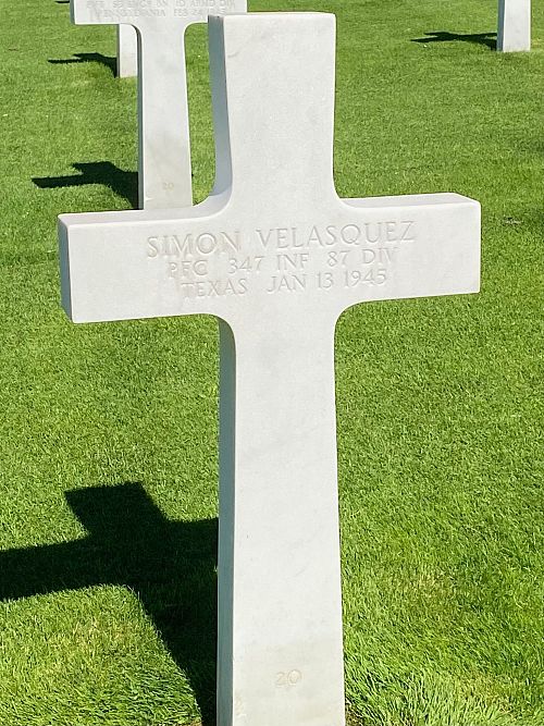 Pfc Simon Velasquez enlisted at Fort Sam Houston, Texas on 25 April 1941.He was first buried at the Temporary American Military Cemetery in Grand Failly, France.