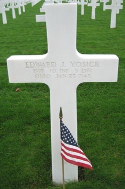 Pvt Edward J. Yosick was a furnaceman before he enlisted at Fort Thomas, Kentucky on 30 May 1944. He was sent overseas in November 1944.Source of information: Leo Minne, www.abmc.gov, www.wwiimemorial.com, www.archives.gov – WWII Enlistment Record, www.ancestry.com – 1920/1930 Census / U.S. Headstone and Interment Record / Diehl Family Tree, A footsoldier for Patton / Michael C. Bilder James G. Bilder, The 5th Infantry Division in the ETO