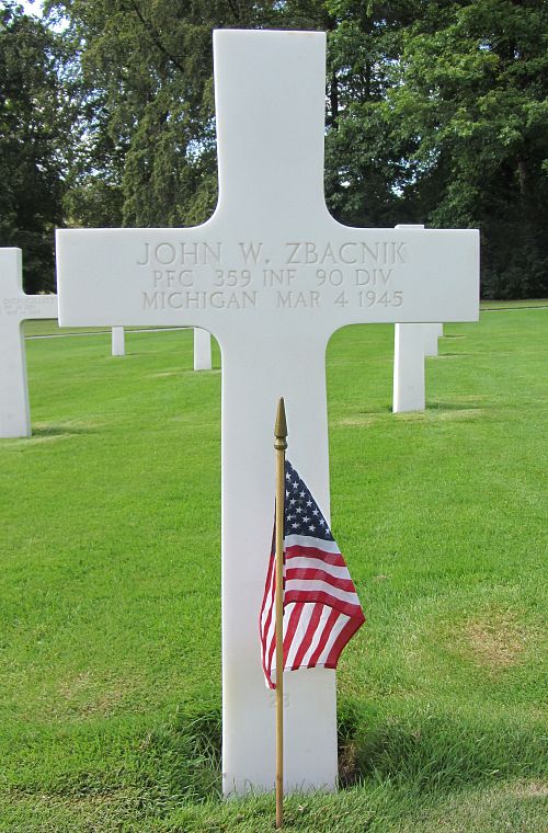 Pfc John W. Zbacnik was shot in the hip during combat in France in January 1945. He was released from hospital and sent back to the front lines. For this wound he was awarded the Purple Heart Medal the first time.Source of information: Peter Schouteten, www.abmc.gov, www.wwiimemorial.com - James Zbacnik, www.ancestry.com - Headstone and Interment Record / 1940 Census