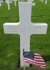 Pvt Stanley W. Zentack was a miner employed by Hughes Coal Co. before he enlisted in Cumberland, Pennsylvania on 28 June 1944.He was killed by artillery shell fragments wounding the side of his body.