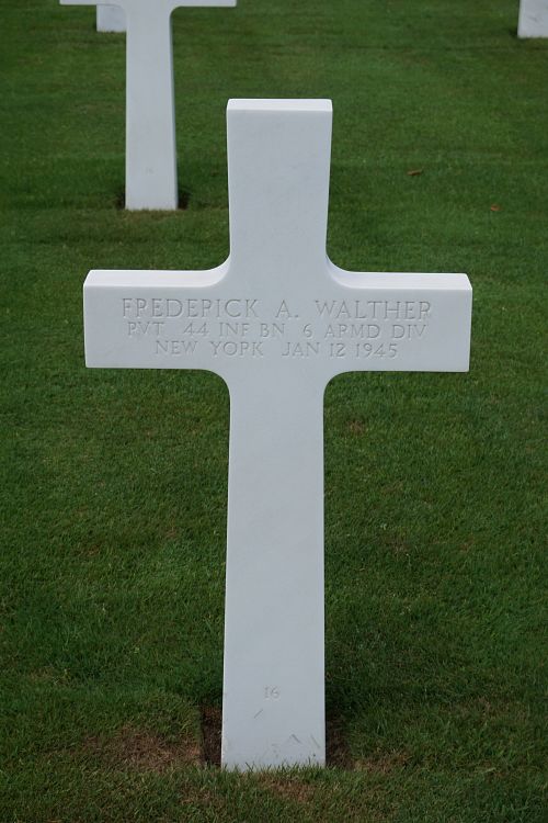 Pvt Frederick A. Walther enlisted at Fort Dix, New Jersey on 15 March 1944.Source of information: Peter Schouteten, www.abmc.gov , www.wwiimemorial.com , www.archives.gov – WWII Enlistment Record, www.ancestry.com - Headstone and Interment Record / U.S. WWII Draft Cards Young Men / 1940 Census, www.findagrave.com , www.super6th.org