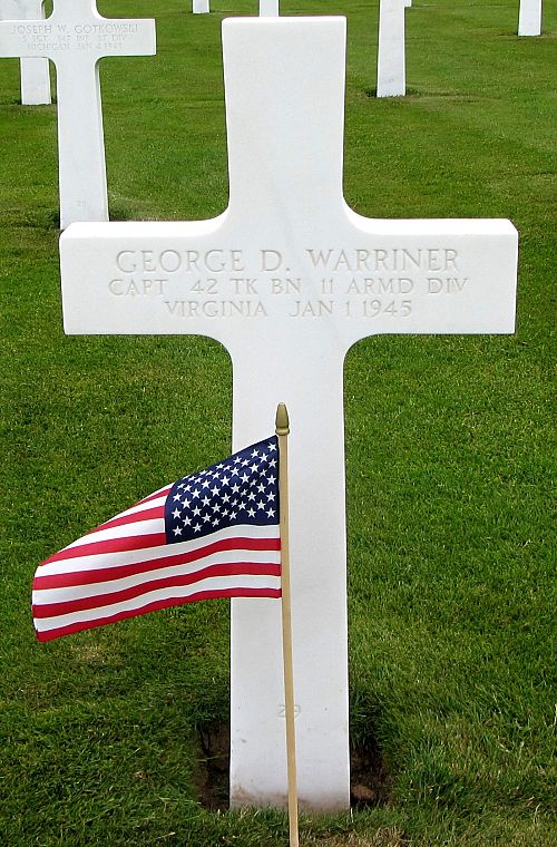 Capt George D. Warriner graduated from Virginia Agricultural and Mechanical College and Polytechnic Institute in 1941. He was married to Mary Barksdale Hutcheson on 23 December 1943.He was awarded the Bronze Medal for heroic conduct in action with an armed enemy. The citation reads in part: "On 1 January 1945, during an attack near ***, Capt Warriner's company was ordered to follow the medium tank enveloping force into ***. During this action, his company came under heavy enemy anti-tank fire which inflicted numerous and severe casualties. Capt Warriner reported the situation over the radio to the battalion commander and immediately moved forward in his tank in an attempt to direct a flanking maneuver to destroy the hostile anti-tank guns. While personally leading his company in this attack, Capt Warriner was killed by a heavy enemy projectile."