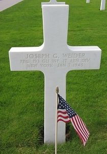 Joseph G. Weider attended Aquinas Institute and was associated with his father in a plumbing and heating business.He enlisted in New York City, New York on 2 April 1943 was sent overseas in August 1943.