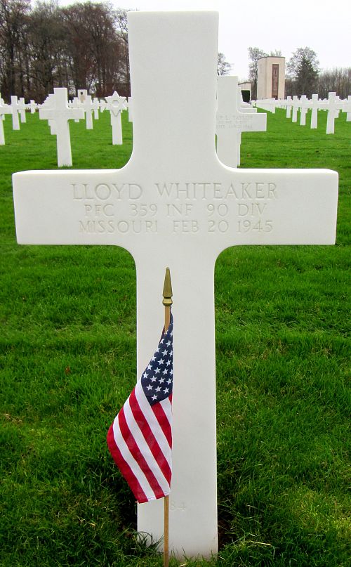 Pfc Lloyd Whiteaker worked on a farm before he enlisted in Jefferson Barracks, Missouri on 5 October 1943.His Bronze Star Medal was awarded posthumously for actions on 8 February 1945 in the vicinity of Hollnich, Germany. The citation reads, "From a dug in machine gun position on a hill overlooking the town, Private First Class Whiteaker provided covering fire for rifle companies attacking hostile positions within the town. Though he was subjected to heavy artillery and machine gun fire from a tank, he remained at his post and placed effective fire upon the enemy which enabled the infantrymen to advance and capture their objective.