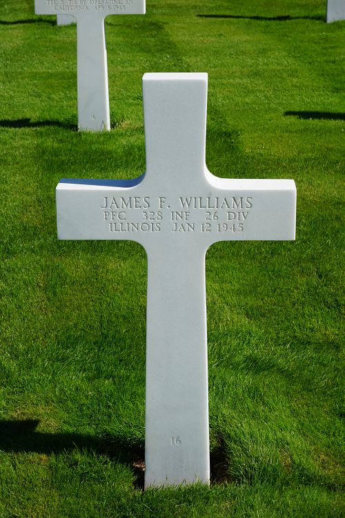 Pfc James F. Williams was employed at the American Marietta Paint Company before he enlisted.Source of information: Peter Schouteten, www.abmc.gov, www.wwiimemorial.com, www.archives.gov - WWII Enlistment Record, www.ancestry.com - Headstone and Interment Record / U.S. WWII Draft Cards Young Men / Seams Tree / 1930 Census, www.fold3.com - 26th Infantry Division