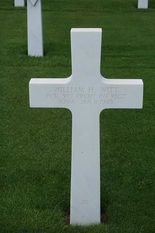 Pvt William H. Witt was employed at the Metz Bakery before he volunteered for the Army of the United States at Fort Des Moines, Iowa on 3 June 1942. He was sent overseas in December 1943 and participated in the invasion of Normandy.He was first buried at the Temporary American Military Cemetery in Grand-Failly, France.