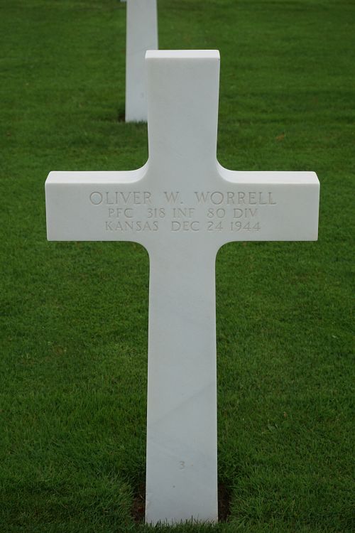 Pfc Oliver W. Worrell attended high school for two years and worked on a farm before he enlisted at Fort Leavensworth, Kansas on 20 March 1944.He was killed by small arms fire which hit him in the neck.