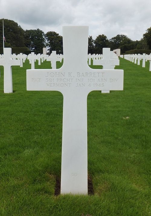 Pvt John K. Barrett attended college and was an industrial engineer in the Time Study Division of Jones and Lamson Machine Company.He enlisted in Rutland, Vermont on 24 January 1944 and was sent overseas in August 1944.