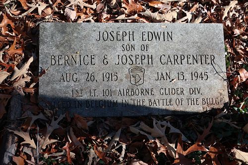 1st Lt Joe E. Carpenter graduated from the University of Tennessee in 1938 and was employed as an assistance county agent for Hancock County, Tennessee.He was awarded the Silver Star Medal posthumously. The citation cited: On 4 January 1945, a strong force of enemy infantry attacked the left platoon of his company and forced it to withdraw. Lt Carpenter, realizing the seriousness of the situation, organized his command post personnel, and launched a counterattack which halted the enemy advance. He then personally regrouped the remainder of the left platoon while under heavy enemy fire and attacked with such force that he restored the original line. By securing the battalion flank, he released the reserve company to support other units. In a later action he was mortally wounded by enemy fire. His courage and inspiring leadership exemplify the highest standards of the military service.