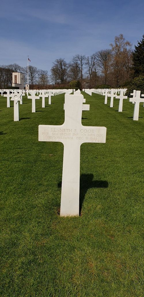 Pvt Kenneth E. Cook enlisted in January 1944. After training with the paratroopers at Fort McClellan, Alabama, and Fort Benning, Georgia, he was sent overseas in October 1944.He was first buried at the Temporary American Military Cemetery of Grand Failly, France.