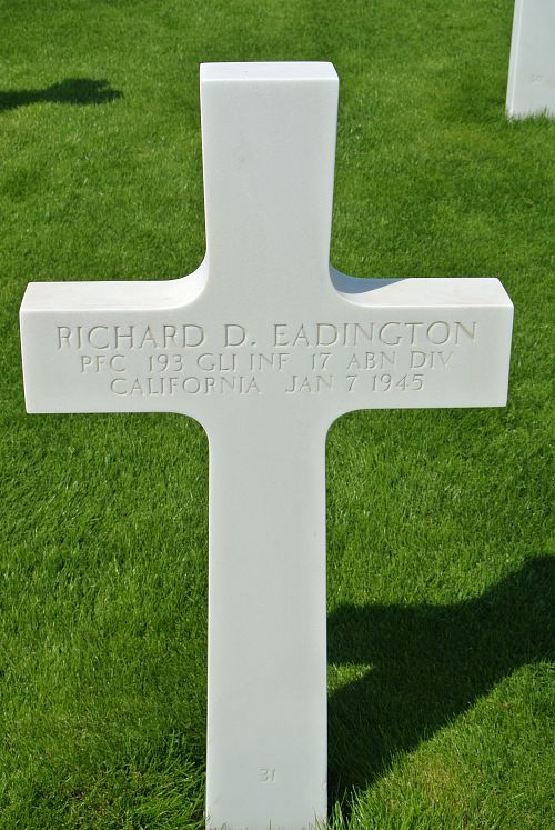 Pfc Richard D. Eadington joined the Regular Army in Fort MacArthur, San Pedro, California on 17 June 1943.He was first buried at Temporary American Military Cemetery Grand Failly, France.