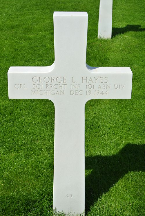 Cpl George L. Hayes was first buried at Temporary American Military Cemetery Grand Failly, France.Source of information: Peter Schouteten, Terry Hirsch, www.abmc.gov, www.wwiimemorial.com, www.ancestry.com - Headstone and Interment Record / Michigan, Marriage Records / 1920 Census, http://www.ww2-airborne.us, WWII Draft Card
