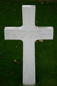 Cpl John Snyder graduated from Albany High School and Wesleyan University in 1933 and attended Yale School of Law from 1933 to 1937. He was admitted to the bar in 1938 and was employed in the law department of New York Power & Light Corporation.He enlisted on 1 March 1944 and was sent overseas in July 1944. He was promoted to corporal in October 1944.