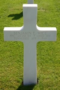 Pvt Benjamin F. Wice was employed by the TVA before he entered the service in 1944. He went overseas in early 1945.He was wounded on 6 April 1945 and died of his wounds on 11 April. He died in a field hospital of sepsis or a blood clot. The exact location is not known.