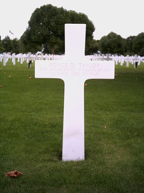2nd Lt Royce D. Taylor attended high school for 4 years and was a clerk. He volunteered for the Air Corps of the Army of the United States in Chicago, Illinois on 2 April 1942.The airplane was shot down by Hauptman Alfred Grislawski flying a FW-190 (J.G. 1) at 1146 hours at 27000 feet shortly after dropping their bombs on the target. With one engine on fire, the crippled B-17G began to lose altitude. The German fighters continued their attack and shot out the second engine on the left wing.
