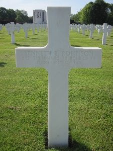 2nd Lt Kenneth E. Robinson attended Miami University in Ohio for two years and entered the Army Air Corps in 1941. He was commissioned at Kirtland Field, Albuquerque, on 12 December 1942 and was sent overseas in June 1943.The Navigator reported that Lt Robinson had pold his parachute in the aircraft and was pulled to the position in which he last saw him. The navigator also told that it was impossible to free him, because he had been pulled into and through the medal of the chip, his parachute was caught in the slipstream of the airplane, holding him fast to his position."