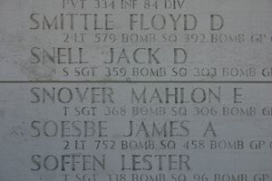 Mahlon Snover graduated from Spencer High School and studied commercial arts at the University of Los Angeles when he joined the Air Corps of the Regular Army at Fort Mac Arthur, California on 1 October 1941.At 0954 hours, the formation leader decided it was unwise to continue under the adverse weather conditions and a wide turn was executed at 21,000 feet and the formation headed for base. Suddenly four or five FW 190´s appeared out of the clouds to attack the group. The pilot, Capt. Friend, having lagged slightly on the homeward turn was immediately attacked by an FW 190 coming in on a steep dive at about 3 o´clock. The #3 engine was hit, caught fire and they left the formation apparently under control. Meanwhile two or three other attacks were made on him and the next time he was observed, fire was enveloping his aircraft along the fuselage to the tail. Seven parachutes were seen to leave the ship at this point. The only other information that his group had had on this crew is that 2nd Lt Frederick, Bombardier of the crew, was washed ashore, dead. This information was from the German Official Report, 17 July 1943 to the International Red Cross.