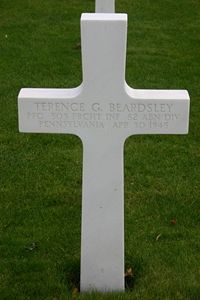Pfc Terence G. Beardsley enlisted in Pittsburgh, Pennsylvania on 11 January 1943. He died April 30 in Germany of wounds received earlier. With the Airborne Paratroopers, Pvt Beardsley had been in service three years, one year of which was spent overseas. He wore the Purple Heart, Bronze Star, Presidential Unit Citation and the Combat Infantryman's Badge. He was employed by the Taylor-Wilson Machine Works, McKees Rocks, before entering service.Source of information: Astrid van Erp, Peter Schouteten, www.wwiimemorial.com, www.specialforcesroh.com, www.archives.gov - WWII Enlistment Record, www.ancestry.com - Family Tree / Veteran Compensation Application File, www.newspapers.com - The Pittsburgh Press
