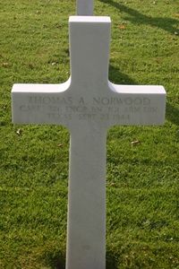 "Capt Thomas A. Norwood distinguished himself by heroic achievement in action. On 17 September 1944 his engineer platoon accompanied an infantry regiment in its approach to a vital bridge in the vicinity of Veghel, Holland. Capt. Norwood and his engineers were among the first to reach the bridge. Although the bridge was intact, the span which connected it to the highway was too narrow to permit a steady flow of two-way traffic. After surveying the situation, he decided to erect a secondary bridge which would be strong enough to support heavy tanks, and at the same time permit two-way traffic. With the help of the Dutch Underground, he gathered together several civilian engineers of the town who were able to supply him with the necessary timbers and supports to construct the bridge. He worked steadily for twenty-three hours, harassed by sniper fire from the enemy who had infiltrated towards the position. Through his skillful leadership and initiative he completed the new bridge in time to accommodate the first British relief troops en-route to Arnhem. The bridge, since its construction, has increased the flow of traffic, and has upheld the heaviest armored traffic. Capt. Norwood later died of wounds received in action. His actions were in accordance with the highest standards of the military service.”