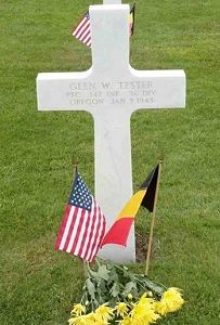 Pfc Glenn W. Tester was employed by a lumber company at Bend before he enlisted in August 1942. He had been overseas almost a year, participating in operations on the Anzio beachhead and the march on Rome.He was reported wounded in action in Southern France on 24 August 1944 and, after a long hospitalization, had been back with his outfit only a short time before his death.