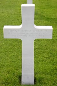 The plane was last seen behind the formation with engine #2 on fire at 5350N – 0658E and probably crashed into the north sea. Five parachutes were observed. There were 3 survivors, James E. Peacock, Ernest P. Colvin and James X. Mcilwain who were saved by an German boot and taken POW. Frank J. Beauregard bailed out but drowned and washed ashore. Kenneth B. Rutledge, Albert E. Mahe, Raymond R. Rodenbaugh and Robert S. Balsey are on the walls of the Missing at Cambridge. Thomas E. Merit and Milton Wauneka on the Walls of the Missing at Margraten.Sgt Frank J. Beauregard was first buried at Temporary American Military Cemetery Ardennes, Belgium Block S, Row 1, Grave 6.