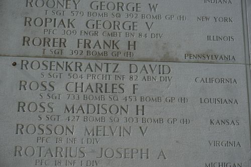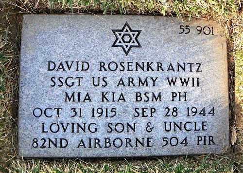 S/Sgt David Rozenkrantz enlisted in Fort MacArthur, San Pedro, California on 29 January 1942. After training at Fort Benning and Fort Bragg he was assigned to Company H, 3rd Battalion, 504th Parachute Infantry Regiment, 82nd Airborne Division. David fought in Sicily, Italy, and Europe. He was killed in a SS Panzer Division counter-attack during Operation Market Garden. Original H Company member and veteran of the Sicily, Naples-Foggia, Anzio campaigns.According to reports, Rosenkrantz sprained his ankle during the combat jump into Sicily on the early morning of July 10, 1943. He and Cpl Lee Black, a medic, hid until daylight so that he could recover, then set out walking to find the rest of their unit.