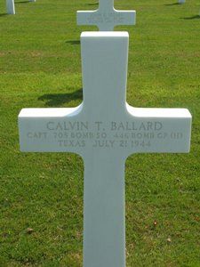Capt Calvin T. Ballard graduated from Austin High School and attended the University of Texas before he joined the Air Corps of the Regular Army at Fort Sam Houston, Texas on 19 March 1941.He served as Nose Turret Gunner on board B-24 #42-100315 "Quivering Box" on the 21 July 1944 mission to Munich, Germany. The Liberator was hit by Flak on return from the mission and Capt Ballard remained stuck in the nose turret. Its doors were jammed and he went down with the plane which exploded and hit the ground. Three crew members were taken prisoner, eight men were killed.