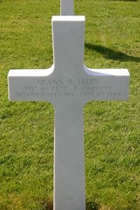 Frank B. Isley was employed at a drug store.He enlisted on 23 September 1943 at Fort Bragg in North Carolina and received his basic training at Fort Knox, Kentucky. He was then sent to Fort George G. Meade in Maryland for advanced training. He sent overseas around June 1944.