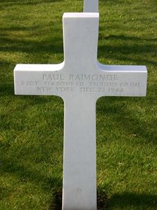 S/Sgt Paul Raimonde enlisted in New York City, New York on 23 April 1943.At approximately 12 o´clock noon the airplane was attacked by German fighters. On the first pass the radios were shot out, including the left engine and part of the controls. The pilot recovered and tried to get back in formation, which was impossible on one engine. He tried to call the crew for a check. The radios were out and they were in no immediate danger so they headed for home, losing altitude steadily. The bombardier shooting out all his ammunition on the frontal attack came out of the nose. He was sent to the back of the tail to see if help was needed, they were under constant attack. The bombardier came back a few seconds later telling the rear bomb bay was on fire and that the ammunition cases were going off. The pilot dropped the bombs and told him to bail out, since all the instruments were shot out and the plane was on fire. He gave the signal for bailing out and left the bell ringing, the altitude was 6,000 feet. The co-pilot was told to bail out since the cockpit was filling with smoke. As the co-pilot prepared to leave he said the right engine was on fire. The bomb bay (forward) was aflame, so they dropped the wheels and the co-pilot went out the nose wheel door. The pilot did not know for certain whether the men in the tail section were still in the plane or not. He decided to wait but had to bail out when they lost altitude rapidly. He saw the plane hit the ground and blow up.