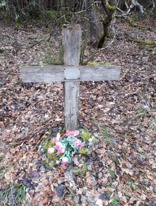 The two killed crew men are remembered on a wooden cross in a forest near Oberschömbach.