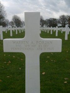 Pfc Warren A. Forjan attended Sellperk High School in Sellersville for four years and was a toolmaker.He enlisted in Allentown, Pennsylvania on 8 October 1943.