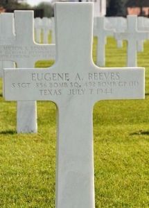S/Sgt Eugene A. Reeves enlisted on 4 November 1942 in San Antonio, Texas.On 7 July 1944, the 492nd participated in a bombing run on a German aircraft manufacturing plant in Bernburg. S/Sgt Reeves's nine-man ship was the first to be hit by the defending Luftwaffe. His ship spun and then suddenly exploded killing everyone inside. The pieces of the plane were scattered over a large area. Only the tail section was found somewhat intact. All of the bodies were recovered but three of them couldn't be individually identified.