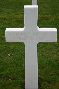 Pfc Haden E. Barkley was a chauffeur before he enlisted at Fort Sill, Oklahoma on 15 April 1944.He was first buried at Margraten Cemetery on 10 April 1945. He was disinterred on 4 August 1948 and his remains were prepared and placed in a casket on 13 August 1948. He was given his final resting place on 4 January 1949.