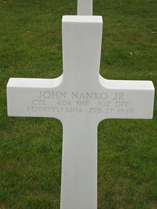 102nd Ozark Division. John ´Yankee´ Nanko was killed in action in Germany near Erkelenz on the way to the Rhine. His brother Michael (Mike) died also during WWII and is buried at Fort Bonifacio, Manila, Philippines.Source of information: Astrid van Erp, Homer V. Wagnon, http://ozarks102id.org, www.wwiimemorial.com, www.fold3.com