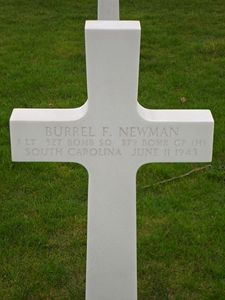 Burrel F. Newman attended Clemson earning a BS degree in Industrial Education. He taught industrial education in Orangeburg for a year before entering the service on 14 July 1940. He tfirst rained with the 29th Infantry Regiment and the 502nd Parachute Battalion at Fort Benning and had jumped sixteen times while in the Parachute Battalion. He transferred to the Air Corps and was trained at Maxwell Field, Shaw Field, Spencer Field, Hendricks Field and Sioux City, Iowa before being sent to England in April 1943.The formation was attacked by approximately 200 enemy fighters over the target. Two singled out this airplane. It exploded in mid-air.