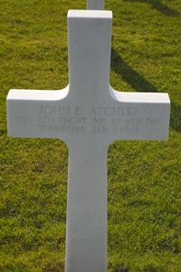 Pfc John E. Atchley enlisted at Fort Oglehorpe, Georgia on 1 January 1943.He was awarded the Distinguished Service Cross for extraordinary heroism in action against the enemy on 7 June 1944, in France. When the enemy counterattacked with tanks in the vicinity of Ste. Mere Eglise, one of the very few anti-tank guns at the disposal of the defending force had been put out of action due to the fact that most of the members of its crew were casualties. As the enemy tanks approached, Pvt Atchley despite the fact that he had never previously fired an antitank gun, left his place of cover and fearlessky moved over to man the gun. Although without aid, Pvt Atchley's second shot destroyed one of the advancing tanks, whereupon the other tanks turned about and retreated. The courage daring and complete disregard for his life displayed by Pvt Atchley reflects great credit on himself and is keeping with the highest traditions of the Armed Forces.