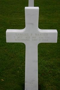 T/Sgt Samuel F. Baxter was a power station operator before he enlisted in Jacksonville AAF, Florida on 25 August 1941.He was wounded by a shell fragment at his machine gun position and taken prisoner on 16 December 1944. He most likely died at Stalag XII-A