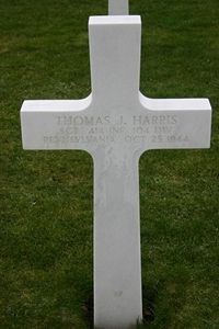 Sgt Thomas J. Harris was a plumbers apprentice before he enlisted in Allentown, Pennsylvania on 17 November 1942.He was awarded the Silver Star Medal posthumously for conspicuous gallantry and intrepidity in action against the enemy. The citation cited: On the night of 25 October 1944, Sgt Harris' battalion encountered severe enemy machine gun fire delivered from well concealed positions. After lying for 45 minutes in open terrain swept by four bands of enemy machine gun fire, it became necessay for the battalion to withdraw. Sgt Harris, realizing that covering fire should be given to the battalion as it moved to the rear, without regard for his personal safety and in the face of the heavy enemy machine gun fire, crawled forward and attempted to set his machine gun in action. Sgt Harris was killed just as he was about to get the machine gun into operation, and, although he failed to complete his self-assigned mission, his personal valor, tenacity of purpose, and unwarering devotion to duty is in keeping with the finest traditions of the military service.