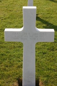 Francis Jacobs enlisted in the Army on 30 November 1942 in Rochester, New York. He died of wounds suffered November 6 in Germany. He was hospitalized and passed away in Belgium, November 8, 1944.He attended Victor High School and later worked for the Victor Insulating Corporation before enlisting in the Army. After training in Louisiana, Florida and Virginia he was sent to England in October, 1943.