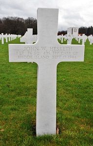 1st Lt John W. Hesketh graduated from Pawtucket High School in 1939.Statement by Lt Pollock, the co-pilot who survived: "Lost formation over Channel, 10 minutes out from Belgian coast. Flew around, attempting to get bearings. Located Lt Howard's plane and followed it to landfall at Ostend. We were just south of the course, made corrected heading and flew up to ETA and hadn't located Ghent, continuing on, during this time, with Howard. Located small town, from name on railroad station and followed railroad to Ghent, then continued on course. Ceiling continued to improve from that point. Reached IP and again corrected heading flying toward Reusel. Were off to west of course; were ten minutes flying time out of IP, flying at 800 feet - Mean Sea Level - when subjected to heavy enemy fire which included flak, small arms and 20 mm. The left engine and fuel tanks were hit and the entire under section of the fuselage was aflame. The radio operator, Martin Worobrow, gave the alarm. Lt Hesketh gave orders to bail out. He, meanwhile, remained at the controls. The radio operator, crew chief and Lt Pollock, in that order, cleared the ship. In the pilot's compartment, Lt Hesketh told Lt Pollock to get going. Lt Pollock saw Lt Hesketh stand and reach up with both hands to unfasten the escape hatch. F/O Colston, in towed glider, observed this hatch leave the ship. Lt Pollock turned toward the rear door, unfastening his flak suit and adjusting his parachute as he moved and jumped without again looking back.