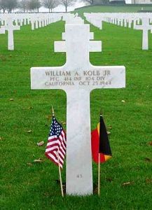 Pfc William A. Kolb Jr. enlisted in Fresno, California on 1 April 1943.Desperate for more ammo and being nearly run over by the Germans, Kolb was ordered to go for more ammunition. Upon his return he observed his men in retreat and taking heavy fire from a German machine gun nest. Kolb jumped into his position and with the fresh ammo, he began giving the Germans a savage return of fire, which served to provide cover for the retreating American force. It was this decision that cost Pvt Kolb his life. For this action, he was awarded the Silver Star Medal posthumously.