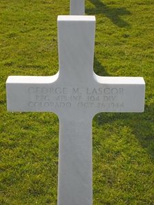 Pfc George M. Lascor enlisted in Pueblo, Colorado on 11 November 1942. He worked on a farm before he enlisted.Source of information: Astrid van Erp, Arjan van Hassel, Peter Schouteten, www.wwiimemorial.com, www.fold3.com, www.archives.gov - WWII Enlistment Record, www.ancestry.com - Headstone and Interment Record / 1930 Census / Family Tree / U.S. WWII Draft Cards Young Men