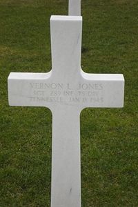 Sgt Vernon L. Jones entered the service on 16 November 1943 at Ft Oglethorpe, Georgia having worked as a farmer.Source of information: Astrid van Erp, Terry Hirsch, www.wwiimemorial.com, www.findagrave.com, www.ancestry.com - Headstone Inscription and Interment Record / 1940 census / United States World War II Army Enlistment Records, www.blounttn.org