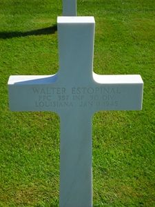 Pfc Walter Estopinal enlisted in New Orleans, Louisiana on 8 October 1942.Source of information: Astrid van Erp, Alexandre Ryelandt, Peter Schouteten, Carla Mans, www.wwiimemorial.com, www.fold3.com, www.ancestry.com - U.S., Headstone and Interment Records for U.S. Military Cemeteries on Foreign Soil, www.archives.gov - WWII Enlistment Record
