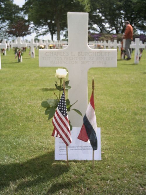 Sgt Charles L. Burghduff was first buried at the Temporary American Military Cemetery of Molenhoek, the Netherlands. After being disinterred, his remains were evacuated to Margraten where he was initially buried in a temporary grave. After the cemetery was given a permanent status, Sgt Burghduff was given his final resting place on 7 July 1949.