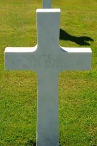 2nd Lt Robert E. Allen was a veteran of two phases of the war, he first flew fifty missions from Africa as a ball-turret gunner on a B-17 in 1943. He had been flying from an English base since December, 1944, when he returned to Europe after earning his commission as a navigator.After dropping paratroopers, his airplane was hit by flak but managed to fly five miles west until it nosed down in a gentle glide into the ground, exploding on contact.