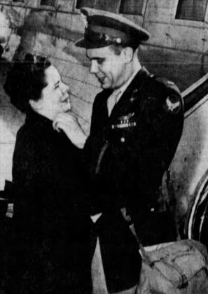 The story with the picture where he is greated by his mother is as follows: He was sent home on leave after seven months of combat and had arrived at the Municipal Airport in Dayton on 14 May 1943. He was known for bringing safely home his crippled ship, Werewolf, after ordering his crew to bail out. With two engines knocked out before he could release his bombs on the primary target, he set out for the secondary target. While dropping his bombs, a third engine was hit. When his plane at last limped in over English land on its remaining engine, he ordered his crew to bail out. They jumped only after he had promied to follow them. He did not abandon the ship, however. Instead he landed the plane on a tiny plot, completely surrounded by trees, so skillfully that it could be repaired and put back into service.